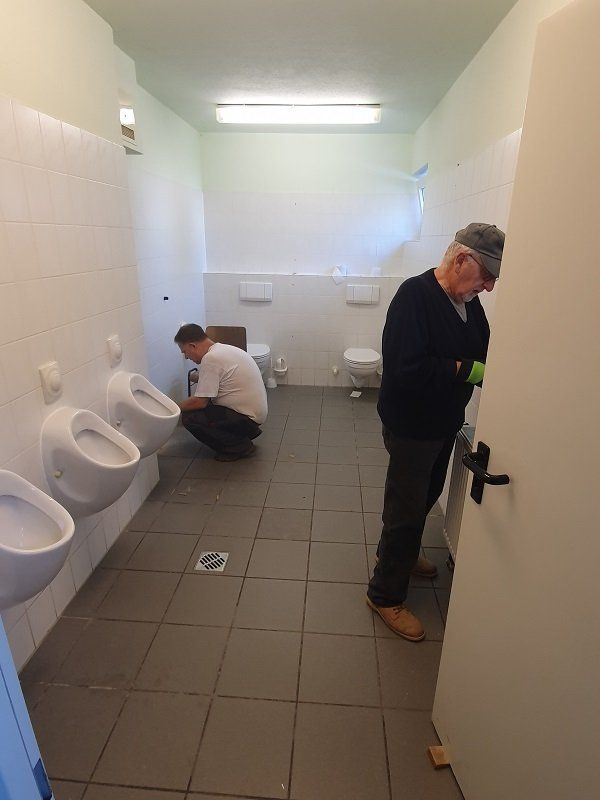 - Toilettenanlage, Bautoilette einrichten und Herrentoilette demontieren.