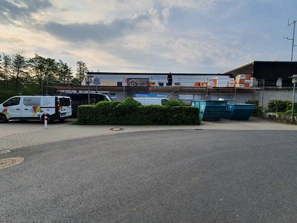 Die Frontseite der Schützenhalle, sowie das Stuhllager/ Garderobe wurden gefliest. Die KK - Halle wurde aufgeräumt, sowie die Schützenhalle und ein 7 m³ Container befüllt. Außenarbeiten (Außenanlage-Grünfläche) wurde durchgeführt.