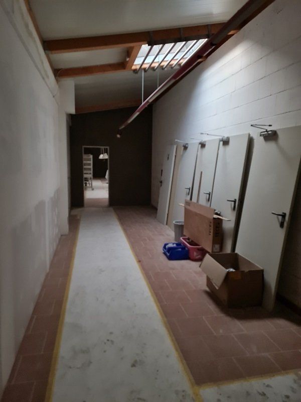 Hat die Damentoilette fertig gestellt in der Halle, nun folgt die Herrentoilette und der Eingangsbereich der Schützenhalle.