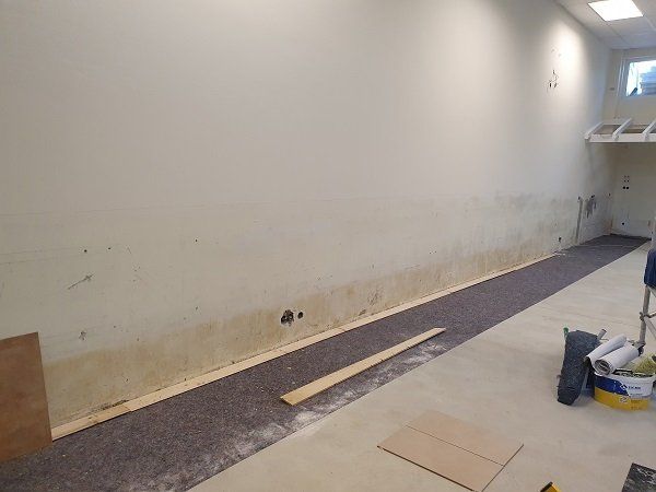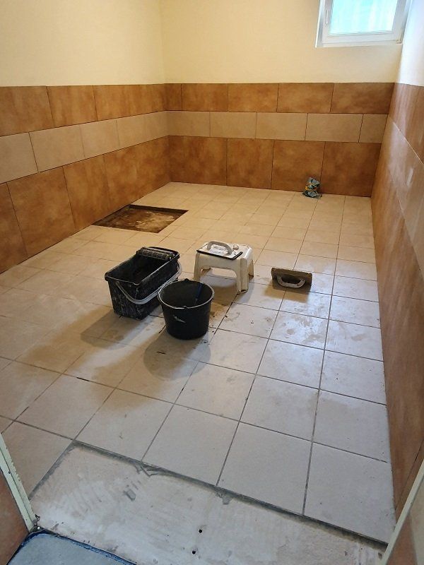 Fa. Lanzerath hat mit den Fließarbeiten in den Toilettenanlagen in der Halle begonnen.
