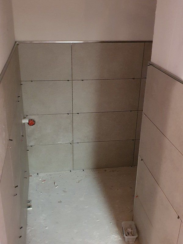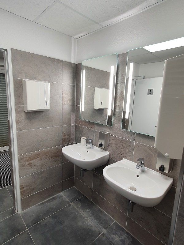 Fa. Fischer: hat mit der Fertigmontage weiter begonnen und Seifenhalter, Spiegel, Handtuchspender und mehr wurde montiert.