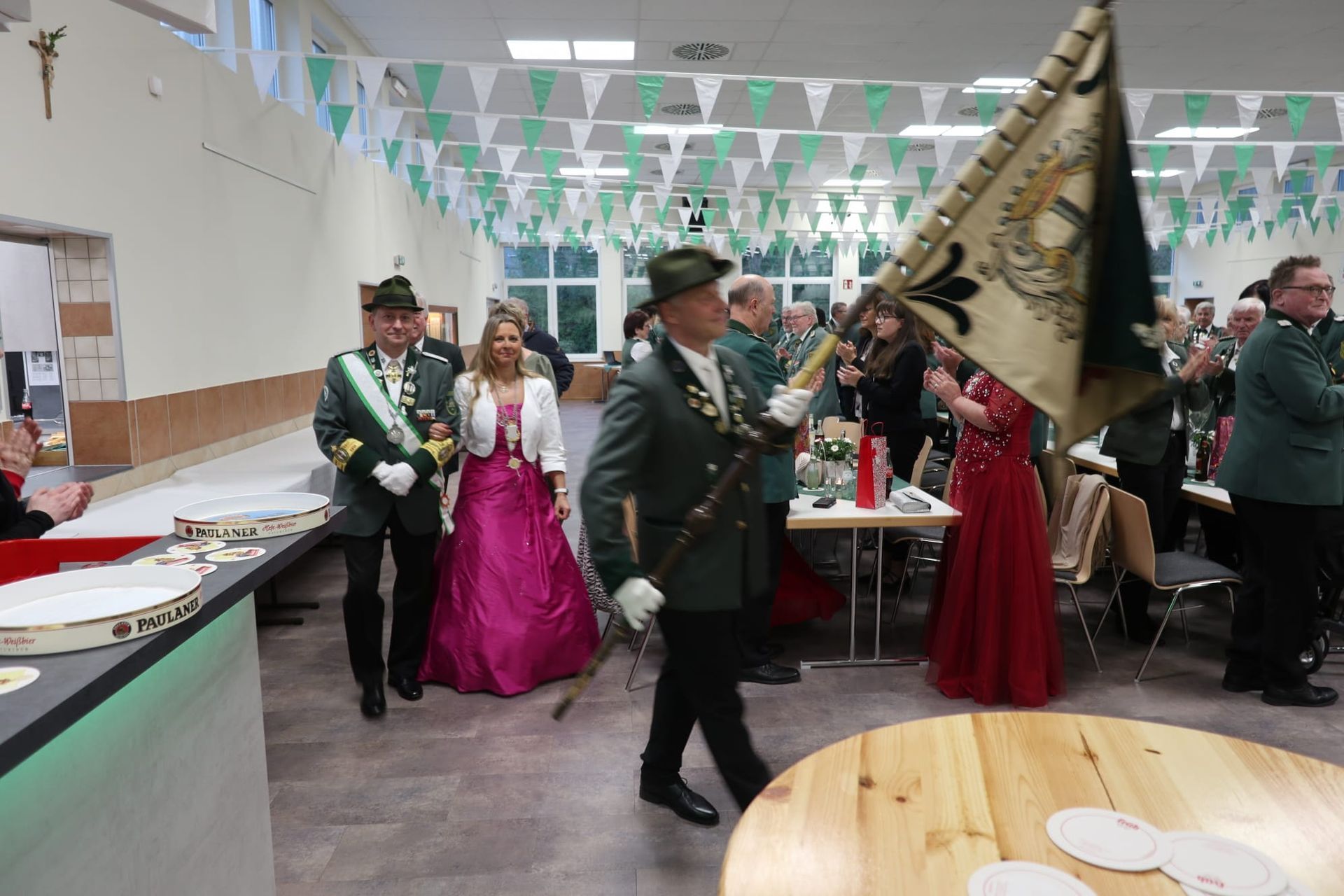 Präsident Matthias Klemmer begrüßte die Gäste und übergab dann das Wort an den stellvertretenden Bürgermeister Tobias Pötzsch, der die weltliche Krönung vornahm. Er überreichte Königin Angelika den Königsorden und ihrem Prinzgemahl Michael einen silbernen Ansteckorden. Für die Bürgerkönigin gab es einen goldenen Erinnerungsorden mit der Aufschrift „Bürgerkönigin 2023/24“.