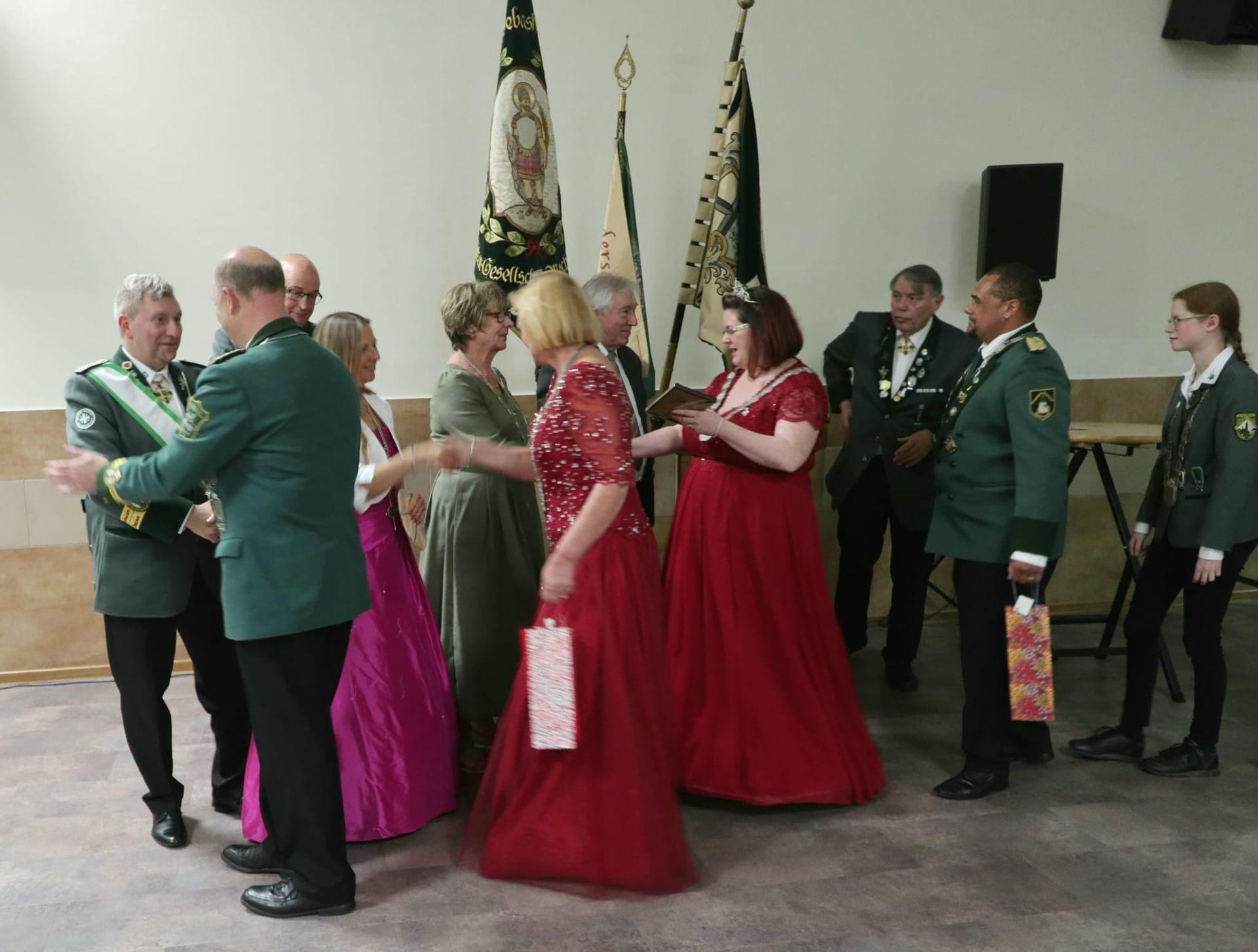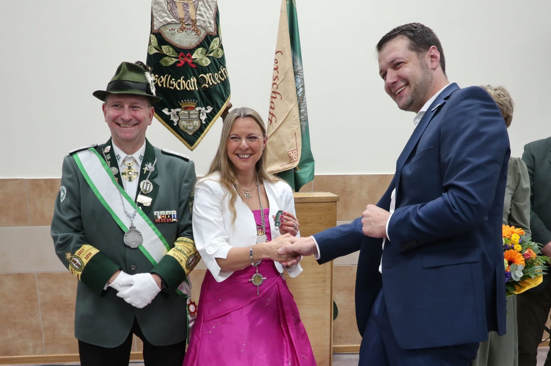 Unter besonderem Applaus wurde eine weitere Majestät nach vorne gebeten. Die amtierende Blütenkönigin Antonia Augenstein hatte es nicht nehmen lassen den Krönungsball der Schützen zu besuchen und einige Worte an die Gäste zu richten. Alle drei weiblichen Majestäten erhielten aus der Hand des stellvertretenden Bürgermeisters bunte Blumensträuße.
