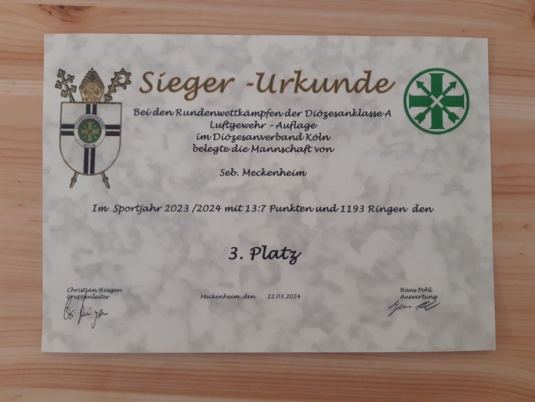 Der letzte Wettkampftag in der Diözesanklasse A Köln, Luftgewehr aufgelegt, wird traditionell als Finaltag ausgerichtet, an dem alle teilnehmenden Mannschaften ihren letzten Wettkampf an einem vorher festgelegten Ort austragen. Gastgebende Bruderschaft war in diesem Jahr Sankt Sebastianus Meckenheim, die die Mannschaften von Rheinbach, Kunibertus Gymnich, Mauritius Bachem, Frechener SV und St. Sebastianus Buschbell in ihrem neuen Schützenhaus begrüßen konnten.