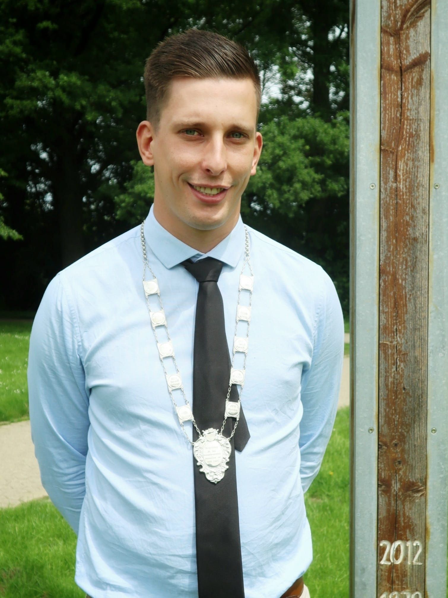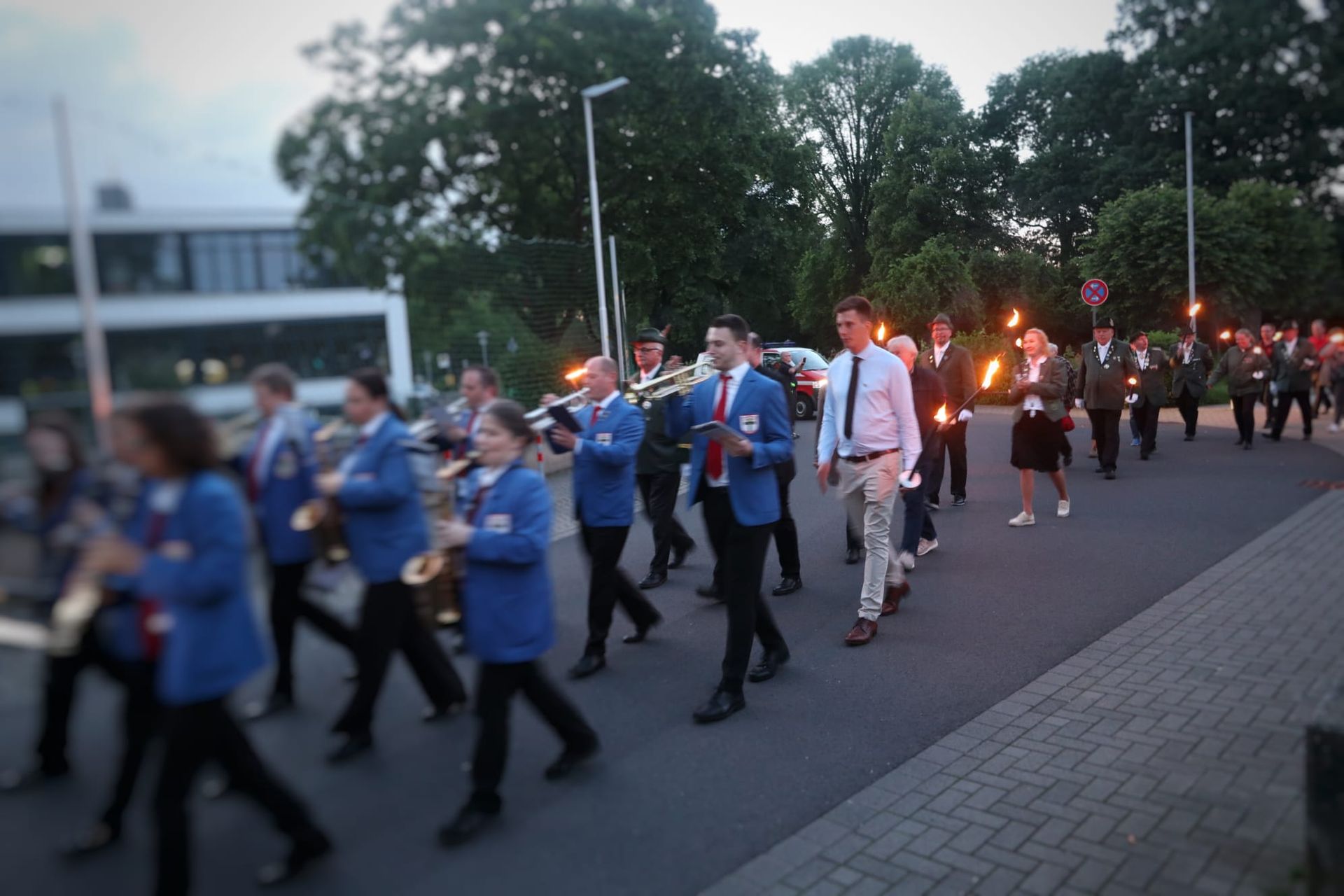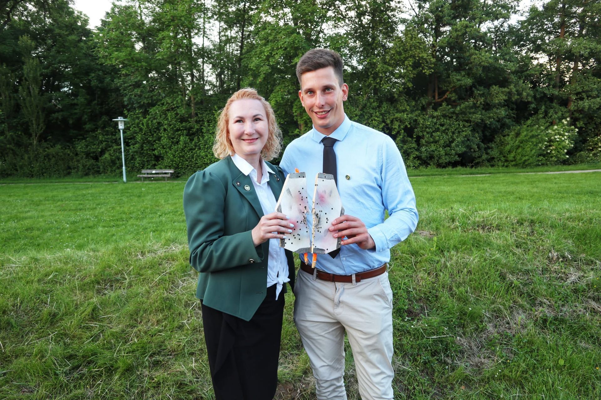 Aber auch inaktive Schützen und Schützinnen und viele weitere Meckenheimer Bürgerinnen und Bürger zeigten ihr Interesse und gingen hochmotiviert ans Werk. Keiner hatte jedoch den 26-jährigen Stabsunteroffizier Maximilian Klemmer auf dem Schirm, als dieser zu einem Zeitpunkt, als der Vogel eigentlich noch nicht fallen sollte, mit dem 355. Schuss selbigen von der Stange holte. Am Abend zogen dann die alten und neuen Majestäten unter den Marschklängen der Stadtsoldaten vor die Kirche, wo zunächst Renate Groesser als Bürgerkönigin von Präsident Matthias Klemmer mit herzlichen Dankesworten und einem Blumenstrauß verabschiedet wurde. Es kommt nicht sehr oft vor, dass ein Vater sein Kind zum König krönt; in Meckenheim kann das schon mal passieren, so am Wochenende. In Vertretung der plötzlich verhinderten stellvertretenden Bürgermeisterin Ariane Stech durfte Präsident Matthias Klemmer seinem Sohn Maximilian die Königskette als Insignie des Bürgerkönigs überreichen.