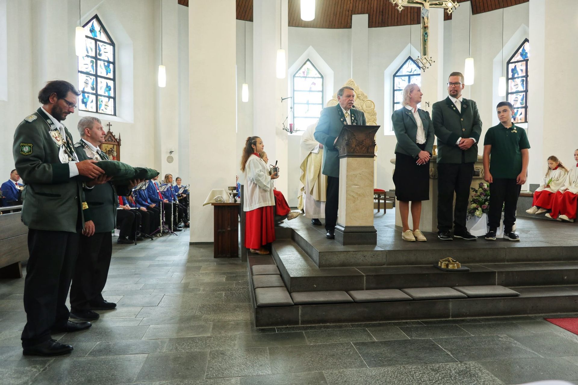 Der Sonntagmorgen stand ganz im Zeichen der neuen Majestäten. Unter Mitwirkung des Musikzuges der Stadtsoldaten Meckenheim ging es vom Schützenhaus in die Pfarrkirche, wo Präses Michael Maxeiner gemeinsam mit Neupriester Thomas Backsmann die Krönungsmesse zelebrierte. Im Anschluss an die Krönungsmesse gedachten die Schützen ihrer Toten und Gefallenen und legten an der Seitenkapelle einen Kranz nieder. Das Schützenfest fand dann am Nachmittag in der Teilnahme am gleichzeitig stattfindenden Bezirksschützenfest in Lannesdorf sein Ende.
