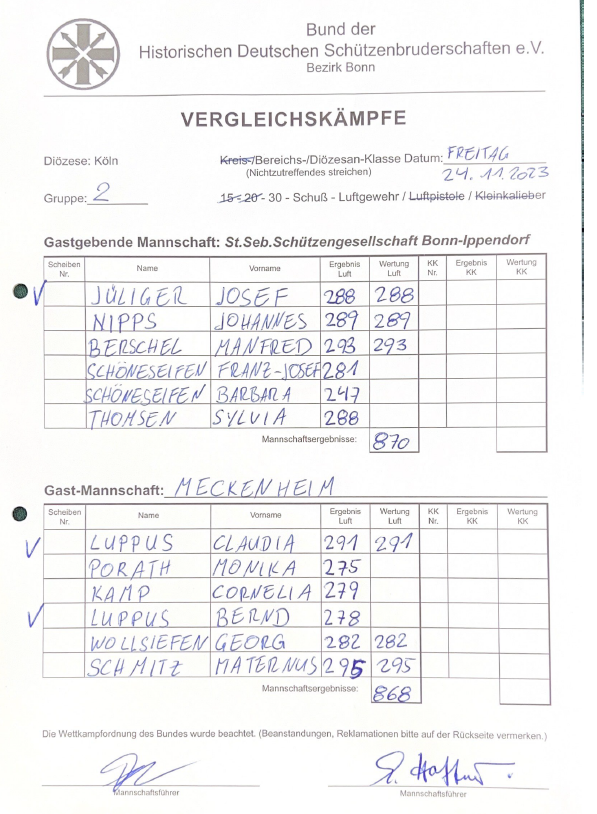 Ergebnis: St. Seb. Schützengesellschaft Ippendorf 870 Ringen und 2 Punkte