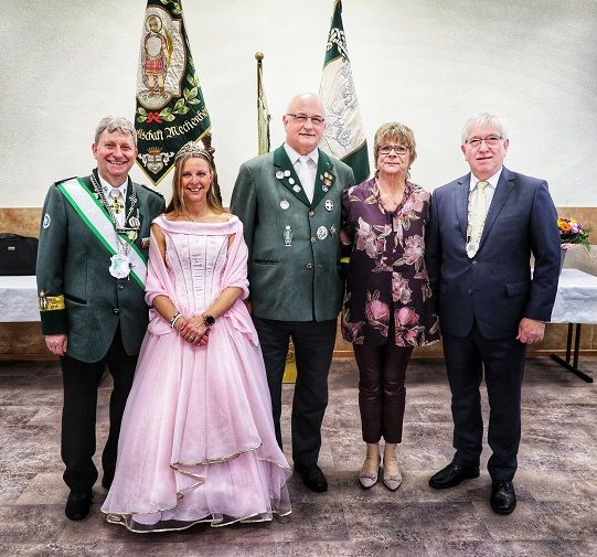 Präsident Matthias Klemmer begrüßte die Gäste und übergab dann das Wort an den stellvertretenden Bürgermeister Tobias Pötzsch, der die weltliche Krönung vornahm. Er überreichte Königin Angelika den Königsorden und ihrem Prinzgemahl Michael einen silbernen Ansteckorden. Für die Bürgerkönigin gab es einen goldenen Erinnerungsorden mit der Aufschrift „Bürgerkönigin 2023/24“.
