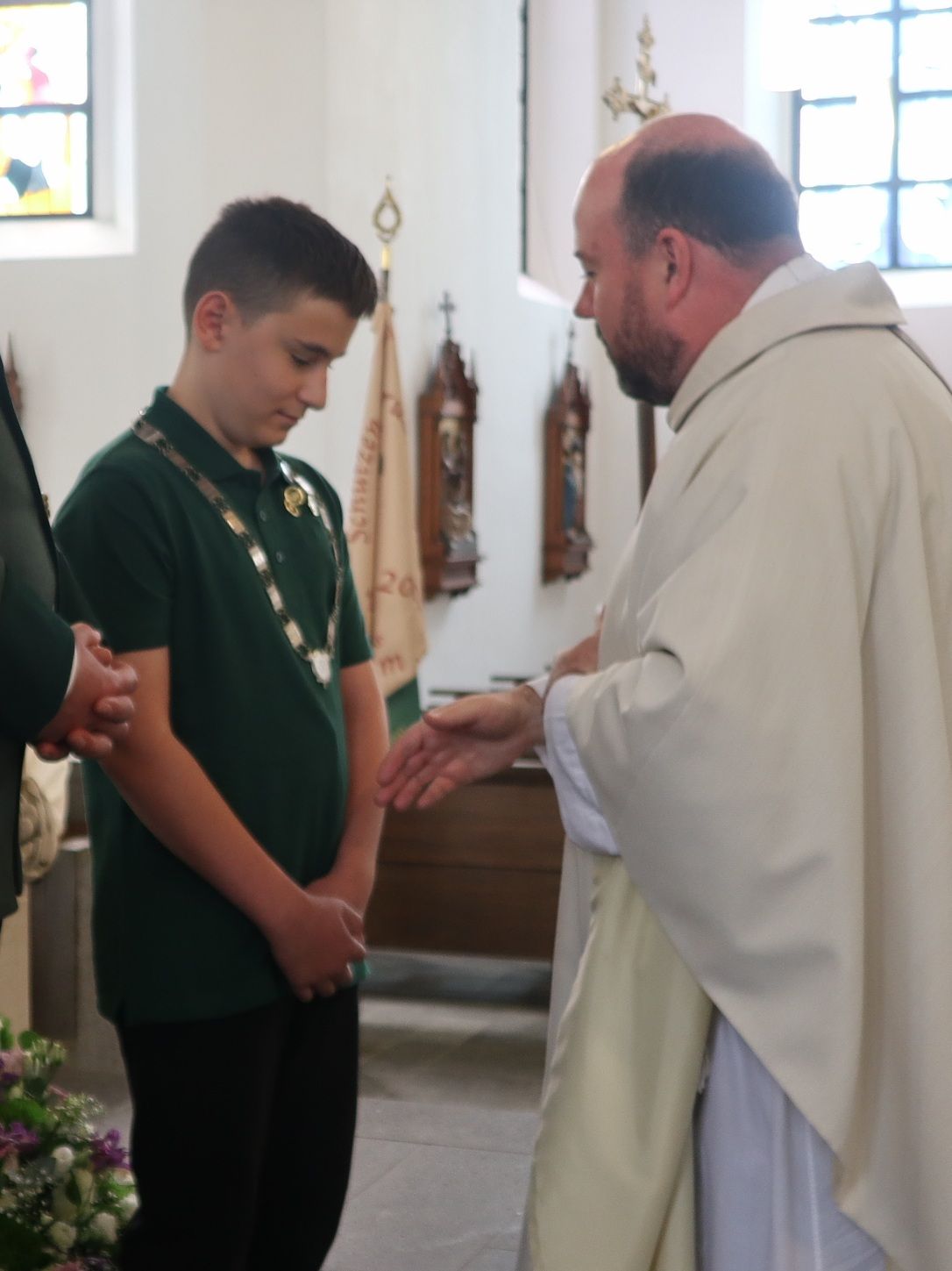 Aber auch inaktive Schützen und Schützinnen und viele weitere Meckenheimer Bürgerinnen und Bürger zeigten ihr Interesse und gingen hochmotiviert ans Werk. Keiner hatte jedoch den 26-jährigen Stabsunteroffizier Maximilian Klemmer auf dem Schirm, als dieser zu einem Zeitpunkt, als der Vogel eigentlich noch nicht fallen sollte, mit dem 355. Schuss selbigen von der Stange holte. Am Abend zogen dann die alten und neuen Majestäten unter den Marschklängen der Stadtsoldaten vor die Kirche, wo zunächst Renate Groesser als Bürgerkönigin von Präsident Matthias Klemmer mit herzlichen Dankesworten und einem Blumenstrauß verabschiedet wurde. Es kommt nicht sehr oft vor, dass ein Vater sein Kind zum König krönt; in Meckenheim kann das schon mal passieren, so am Wochenende. In Vertretung der plötzlich verhinderten stellvertretenden Bürgermeisterin Ariane Stech durfte Präsident Matthias Klemmer seinem Sohn Maximilian die Königskette als Insignie des Bürgerkönigs überreichen.
