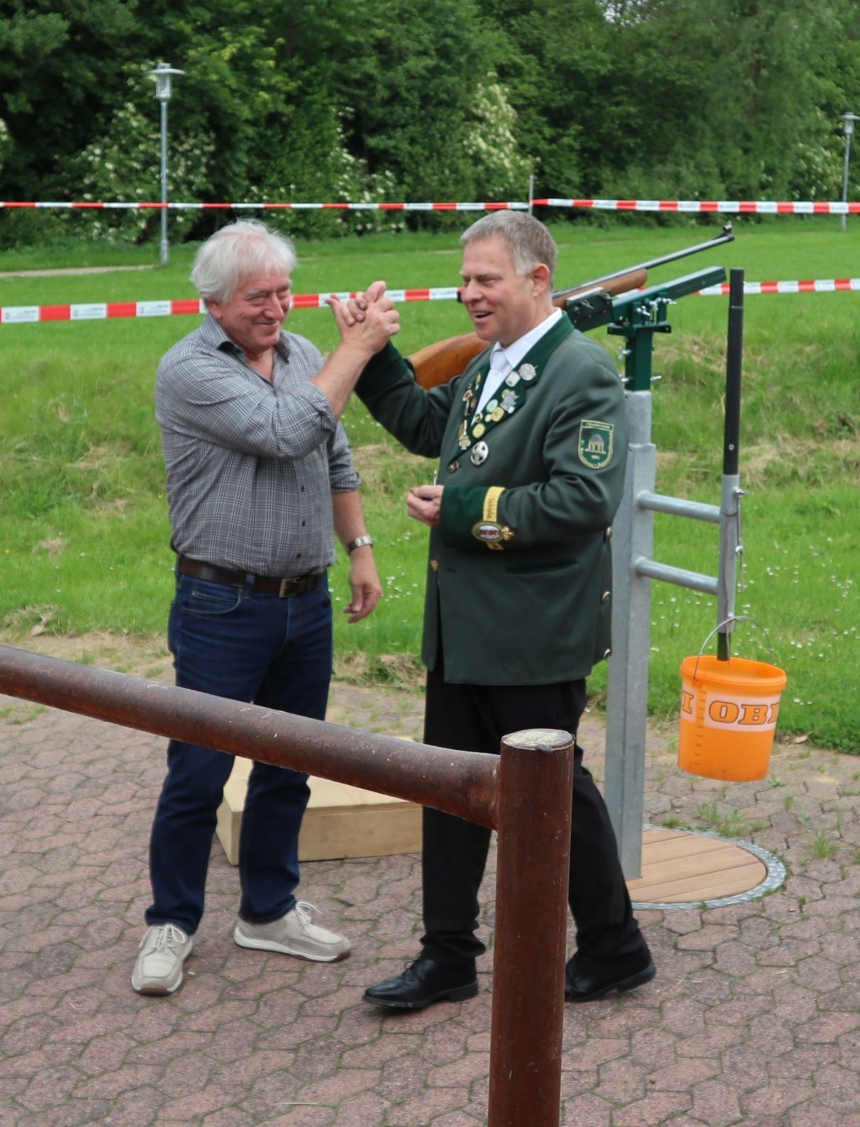Offiziell eröffnet wurde das Schützenfest mit dem traditionellen Fassanstich durch Bürgermeister Holger Jung im Beisein von Präses Pfarrer Maxeiner und Präsident Matthias Klemmer. Zahlreiche Zuschauer hatten sich eingefunden, um bei Freibier und strahlendem Sonnenschein den Schießwettbewerben zuzuschauen. Für eine rege Beteiligung sorgte das zur Kurzweil der Gäste vorbereitete Klotzschießen, bei dem es Geldpreise zu gewinnen gab. Vor dem mit großer Spannung erwarteten Königsschießen wurde aber erst noch das Bürgerkönigsschießen durchgeführt, das von allen Zuschauern aufmerksam verfolgt wurde. Hier gab es im Vorfeld doch sehr viele Anwärter auf die Nachfolge von Noch-Bürgerkönigin Renate Groesser, besonders aus den Reihen der Prinzengarde Meckenheim.